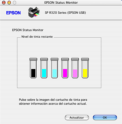 También puede usar esta utilidad para verificar los niveles de tinta antes de imprimir. EPSON StatusMonitor muestra la cantidad de tinta que quedaba cuando se abrió. Si desea poner al día la información sobre el nivel de tinta, haga clic en Actualizar.