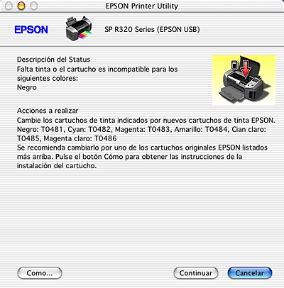 Si queda poca tinta o se agota, aparecerá un botón llamado Cómo. Si hace clic en Cómo, EPSON StatusMonitor le guiará paso a paso en el procedimiento de sustitución del cartucho.