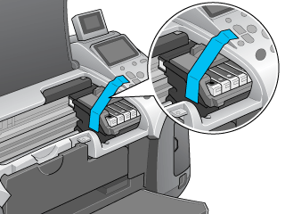 ![]() | Vuelva a abrir la cubierta de la impresora. Fije el soporte del cartucho de tinta con una cinta adhesiva, como se muestra en la figura siguiente, y cierre la cubierta de la impresora. |