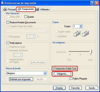 Haga clic en la ficha Composición y seleccione la casilla de verificación Impresión doble cara.