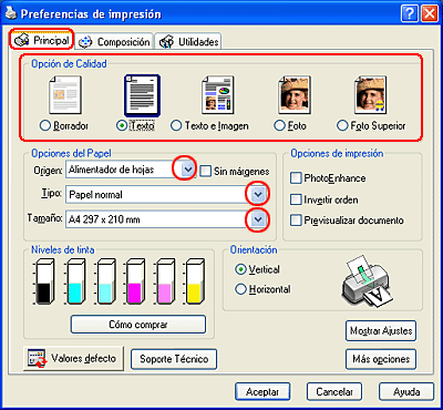 Haga clic en la ficha Principal y luego en el ajuste Calidad. Si desea más información, consulte la Ayuda on-line.