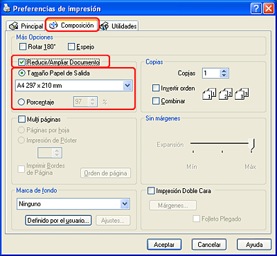 Haga clic en la ficha Composición y seleccione la casilla de verificación Reducir/Ampliar documento. Puede seleccionar los siguientes ajustes para cambiar el tamaño del documento.