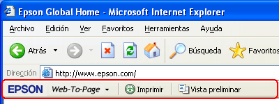 Después de instalar EPSON Web-To-Page, su barra de menús aparece en la barra de herramientas de Microsoft Internet Explorer. Si no aparece, seleccione la opción Barras de herramientas del menú Ver de Internet Explorer, y luego seleccione EPSON Web-To-Page.