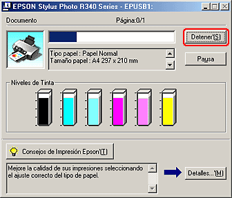Puede cancelar la impresión tanto a través del Contador de avance como de EPSON Spool Manager. Consulte la sección correspondiente más abajo.