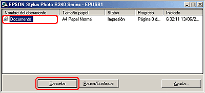 Cuando un trabajo de impresión llega al principio de la cola, EPSON Spool Manager lo envía a la impresora. Puede cancelar trabajos de impresión en el Spool Manager. También puede ver información del estado de trabajos de impresión, así como hacer una pausa, reanudar o reiniciar la impresión.