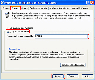 Seleccione Compartir esta impresora y escriba el nombre de uso compartido.
