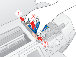 Abra la cubierta del cartucho. Apriete la lengüeta y la parte posterior del cartucho de tinta que desee sustituir. Saque el cartucho de la impresora y deséchelo de forma adecuada. No desmonte ni intente rellenar el cartucho usado.
