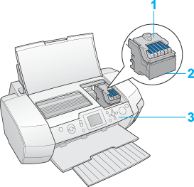 1. Cubierta del cartucho: Sujeta los cartuchos de tinta. Ábrala sólo para instalar o sustituir los cartuchos de tinta.
