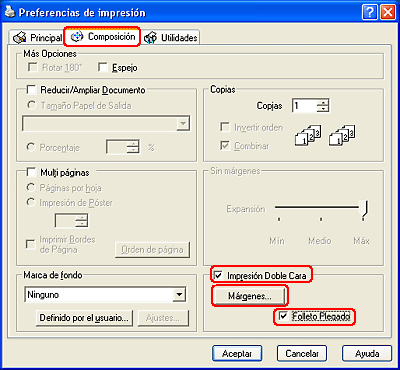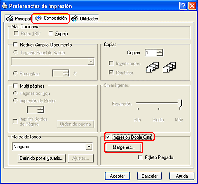 Haga clic en la ficha Composición y seleccione la casilla de verificación Impresión doble cara.