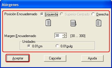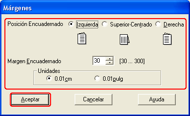 Elija entre cm o pulg. como el ajuste de Unidad. Especifique la anchura del margen de encuadernación.