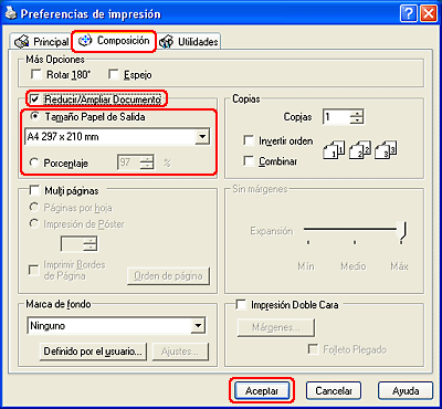 Haga clic en la ficha Composición y seleccione la casilla de verificación Reducir/Ampliar documento.