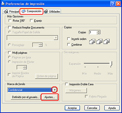 Haga clic en la ficha Composición, elija la marca de fondo deseada en la lista Marca de fondo y haga clic en Ajustes.