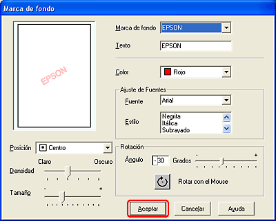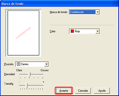 Asegúrese de haber seleccionado la marca correcta en la lista Marca de fondo y seleccione los valores de Color, Posición, Densidad, Tamaño, Fuente, Estilo de fuente y Ángulo. (Para más detalles, consulte la ayuda on-line). Los ajustes se verán reflejados en la ventana de previsualización.