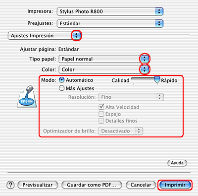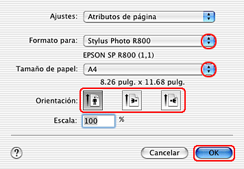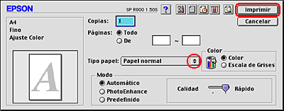 ![]() | Seleccione el tipo de Impresora deseado. Cuando imprima con márgenes estándar, seleccione Stylus Photo R800. |
