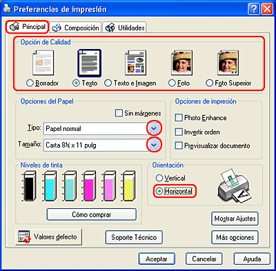 Seleccione Papel normal/Papel blanco brillante como el ajuste de Tipo papel y luego configure los ajustes de Tinta y Modo adecuados. Si desea más detalles, consulte la ayuda on-line.
