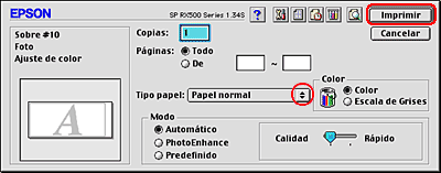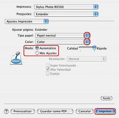 Seleccione Stylus Photo RX500 como el ajuste de Impresora.