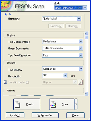 Inicie EPSON Scan y seleccione el modo Profesional. Si desea más instrucciones sobre cómo seleccionar el modo de escaneado, consulte Cambio del modo de escaneado.
