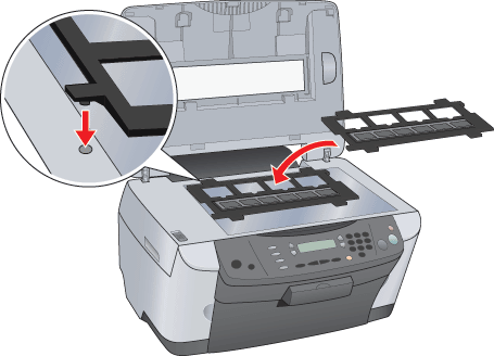 Coloque el soporte para películas sobre la superficie para documentos encajándolo en el orificio del equipo y con el soporte de diapositivas de 35 mm hacia el centro de la superficie.