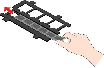 Deslice el borde de la película en el soporte para películas de 35 mm, con el lado de base hacia abajo. Colóquela de forma que todos los fotogramas coincidan con las ventanas del soporte para películas y luego coloque el soporte.