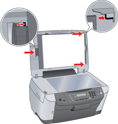 Retire el soporte para documentos reflectantes con suavidad deslizándolo por la cubierta para documentos.