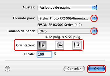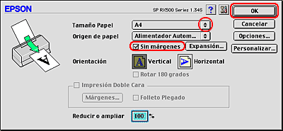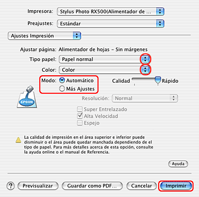 Seleccione Stylus Photo RX500 (Alimentador de hojas - Sin márgenes) como el ajuste de Impresora.