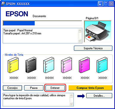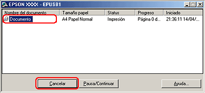 Cuando un trabajo de impresión alcanza el principio de la cola, EPSON Spool Manager lo envía a la impresora. Puede cancelar trabajos de impresión desde Spool Manager. También puede ver información del estado de trabajos de impresión, así como pausar, reanudar o reiniciar la impresión.