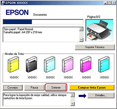 Puede cancelar la impresión tanto a través del Contador de Avance como de EPSON Spool Manager. Consulte la sección correspondiente que se muestra a continuación.