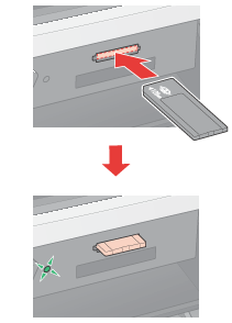 Inserte la tarjeta de memoria únicamente como se muestra más arriba porque en caso contrario podría producir daños en la impresora, la tarjeta o ambas. Si introduce una tarjeta de forma incorrecta, aparecerá un mensaje de error en la pantalla. Haga clic en Cancelar y extraiga la tarjeta de memoria. A continuación, vuelva a insertarla correctamente.
