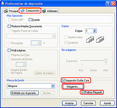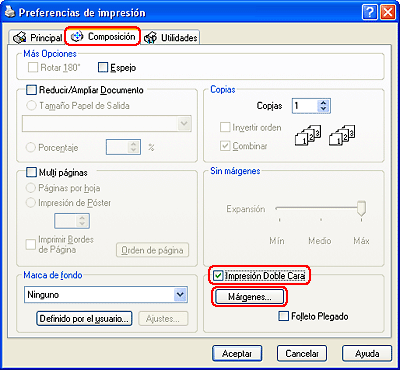 Haga clic en la ficha Composición y seleccione la casilla de verificación Impresión Doble Cara.