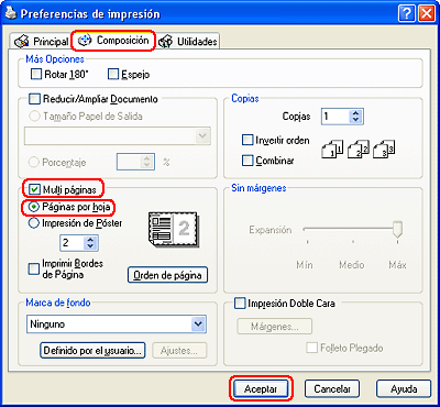 Haga clic en la ficha Composición, seleccione Multi páginas y, a continuación, Páginas por hoja.