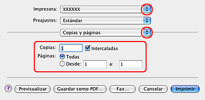 Seleccione la impresora que esté utilizando en Impresora y defina los ajustes de Copias y páginas.