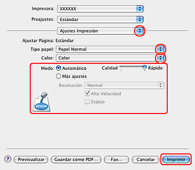 Seleccione los ajustes adecuados para Tipo papel, Color y Modo. Si desea obtener más información sobre Ajustes Impresión, consulte la ayuda en línea.