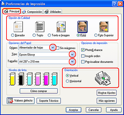 Seleccione Vertical (alto) u Horizontal (ancho) para cambiar la orientación de la impresión.