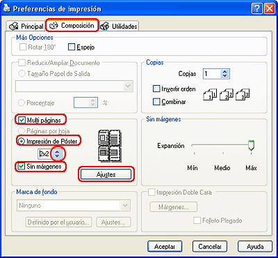 El ajuste Sin márgenes no está disponible para la impresión de póster en Windows Me ni en Windows 98 SE.