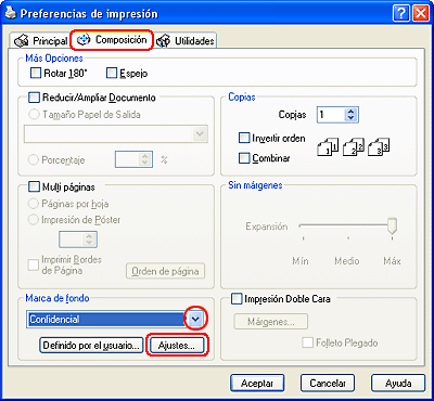 En la pantalla Composición, haga clic en el botón Definido por el usuario... de Marca de fondo. Aparecerá la siguiente ventana.