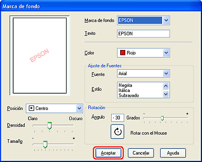Asegúrese de haber seleccionado la marca de fondo correcta en la lista Marca de fondo y, a continuación, seleccione los valores de Color, Posición, Densidad, Tamaño, Fuente, Estilo de fuente y Ángulo. (Para obtener más información, consulte la ayuda en línea.) Los ajustes se verán reflejados en la ventana de previsualización.