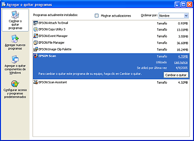 Haga clic en Epson Scan, en la lista de programas instalados y después haga clic en Cambiar o quitar (Windows XP o Windows 2000), o en Agregar o quitar (Windows Me o Windows 98 SE).