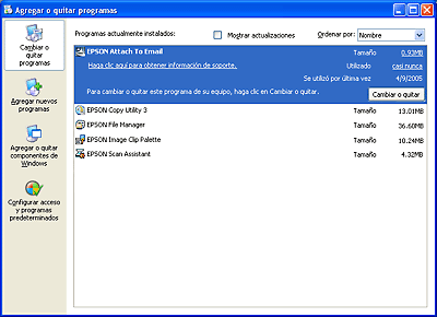 Haga clic en EPSON Attach to Email en la lista de los programas instalados y haga clic en Cambiar o quitar (Change/Remove en Windows XP y 2000) o en Agregar o quitar (Add/Remove en Windows Me o 98 SE).