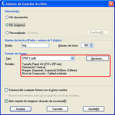 Seleccione PDF como tipo de archivo. Debajo, se mostrarán los ajustes actuales de Tamaño papel, Orientación, Margen y Compresión.