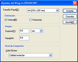 Si desea cambiar algún ajustes actual de PDF, haga clic en el botón Opciones. Verá la ventana Ajustes del Plug-in EPSON PDF.