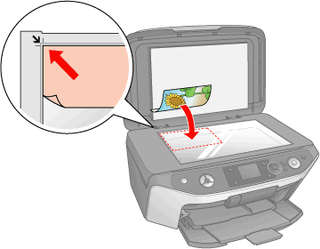 Coloque el documento o foto sobre el vidrio de la superficie para documentos, boca abajo. Compruebe que la parte superior del documento o de la foto esté junto a la esquina superior izquierda de la superficie para documentos.