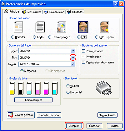 Para la impresión en CD/DVD, se utiliza un nivel de saturación del color más bajo que con el papel especial Epson, y así se garantiza la calidad de la impresión.