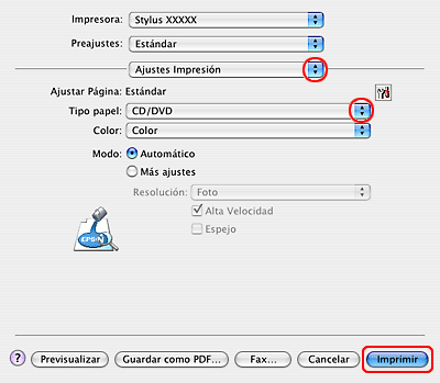 Si imprime en un CD/DVD con un paquete de software disponible en el mercado que admita la impresión de CD/DVD, tendrá que configurar los siguientes ajustes.