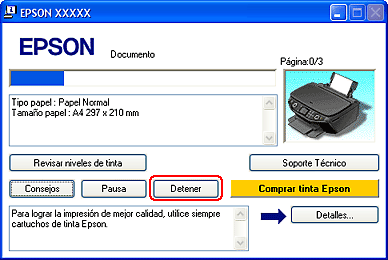 Puede cancelar la impresión tanto a través del contador de avance como de EPSON Spool Manager. Consulte la sección correspondiente más adelante.