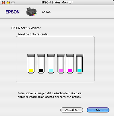 ![]() También puede usar esta utilidad para revisar el estado de los cartuchos de tinta antes de imprimir. EPSON Status Monitor muestra el estado de los cartuchos cuando se abrió. Si desea poner al día la información sobre el estado de los cartuchos, haga clic en Actualizar.
