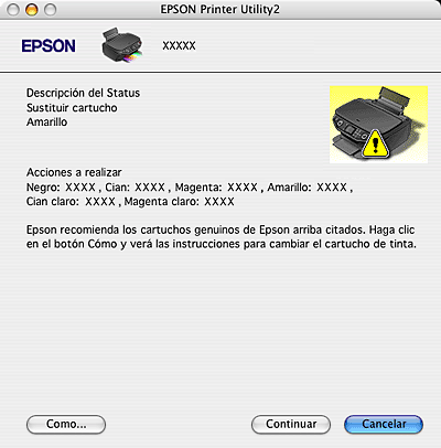 ![]() Si queda poca tinta o se agota, aparecerá el botón Cómo. Si hace clic en Cómo, EPSON StatusMonitor le guiará paso a paso en el procedimiento de sustitución del cartucho de tinta.