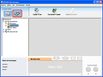 Inicio del escaneado con Epson Creativity SuiteEn Epson Creativity Suite, primero se escanea y luego se guarda la imagen con Epson File Manager. Después, se utilizan las otras opciones de proyecto de la ventana de Epson File Manager para modificar, imprimir, adjuntar o importar los archivos de imágenes.