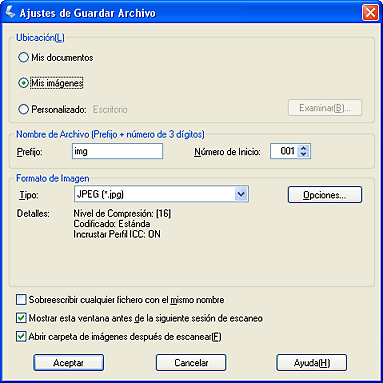 Si ha empezado el escaneado con Epson Scan como un programa independiente (en el Modo Automático), la imagen escaneada se guardará en el formato de archivo y en la ubicación que eligió. Si no ha seleccionado ningún ajuste de guardado de archivo, se guardará como un archivo JPEG en Imágenes o Mis imágenes.
