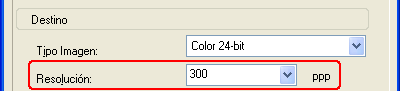 Si va a escanear las imágenes al 100% de su tamaño o menos y no las va a aumentar después, puede aceptar el ajuste de Resolución seleccionado por Epson Scan a partir de sus ajustes de Destino (sólo en Modo Fácil).