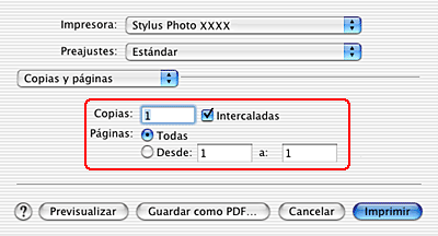 ![]() | Seleccione Stylus Photo RX600 como el ajuste de Impresora y defina los ajustes de Copias y páginas. |